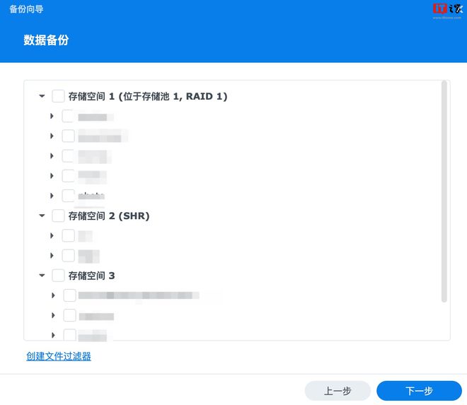 选择需要备份的共享文件夹,可以按子目录选择 / 排除,也可以配置文件过滤器进行自定义过滤。