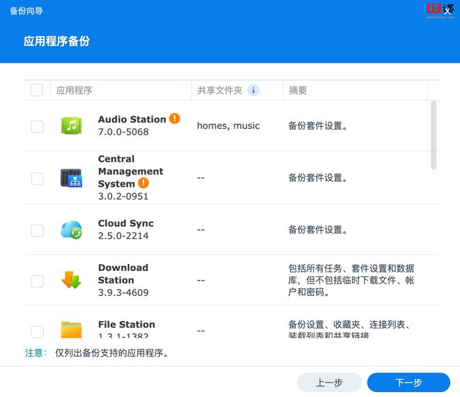 选择需要备份的应用套件。需要注意的是:有些套件会要求必须备份某些共享文件夹,如 Audio Station 会要求备份 homes 和 music 两个共享文件夹的全部数据。