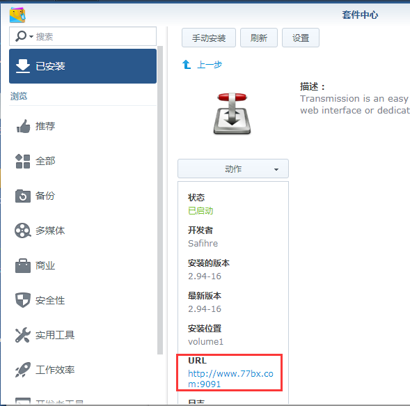 5、安装完成后后,打开“套件中心” —> “Transmission”,找到URL,可以直接打开Web UI