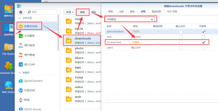 打开“控制面板” —> “共享文件夹” —> “downloads”(刚才安装Transmission创建的下载文件夹名称),点击“编辑”,选择“本地群组”,选择“sc-download”设置为可读写