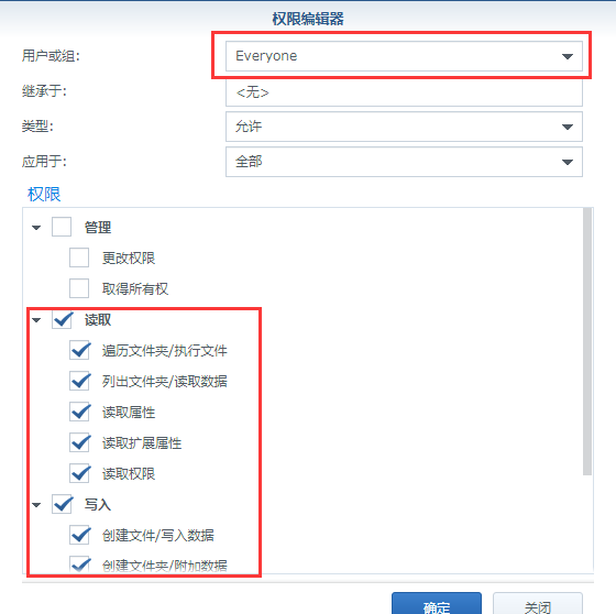 打开“File station”,“downloads”文件夹右击,选择“属性”,新增“Everyone”账号,权限选择“读取”和“写入”,勾上“应用到这个文件夹、子文件夹及文件”,确定