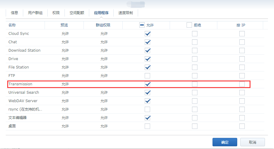 控制面板,用户,编辑权限,应用程序,勾上Transmission允许。