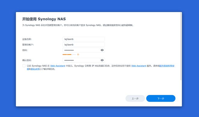 ▼接着设置NAS的设备名称与管理员账户。
