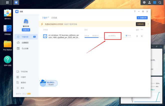 ▼随手下载一个文件测试下载,直接跑满500Mb下行带宽,有一说一,NAS上没有广告,界面简洁的迅雷用来真的很爽,这才是纯真的下载工具。