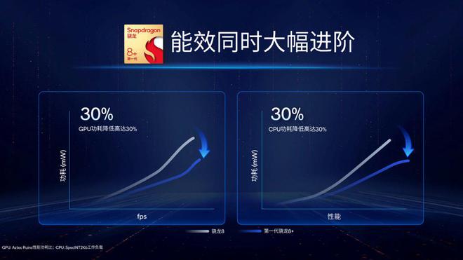 高通官方数据显示,新一代骁龙8+ Gen1进一步提高频率,获得了10%整体性能和30%的CPU性能提升,GPU和CPU能效都提高了30%,同时制造工艺由三星4nm到台积电的4nm。此外,高通还在摄像头ISP、数据安全和音频等部分进行了改进。
