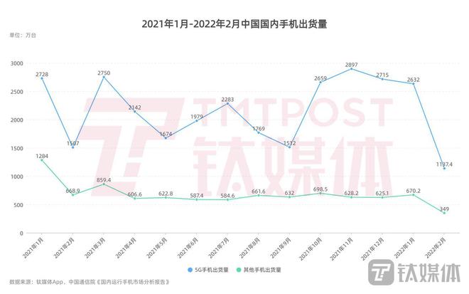 2021年1月-2022年2月中国手机出货量
