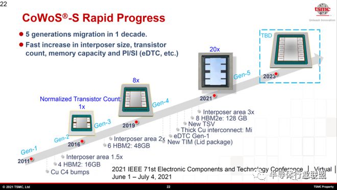 根据规划,台积电将于今年晚些时候宣布第 5 代 CoWoS 封装技术,其有望将晶体管数量翻至第 3 代封装解决方案的 20 倍。