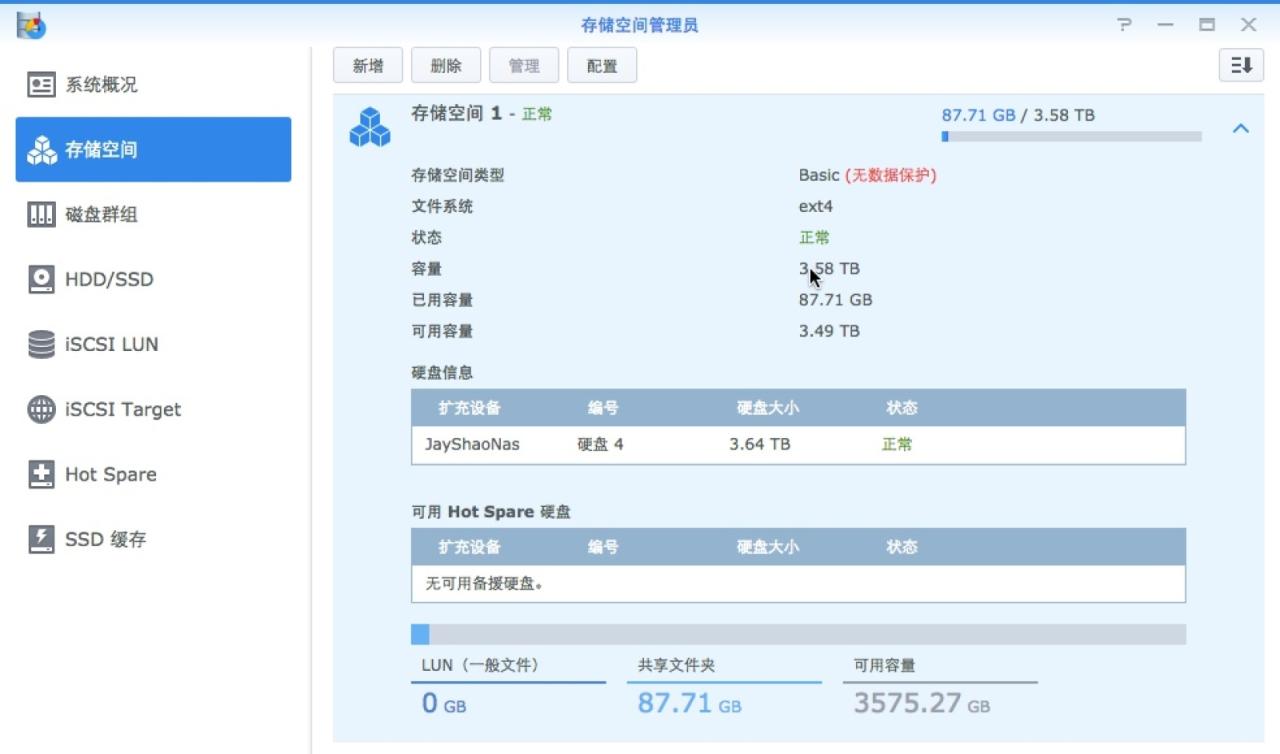 1.点击“菜单”,选择“存储空间管理员”,并选择“存储空间”,这里可以看到你目前使用的存储空间的情况。存储空间你可以理解为是 NAS 的“硬盘”