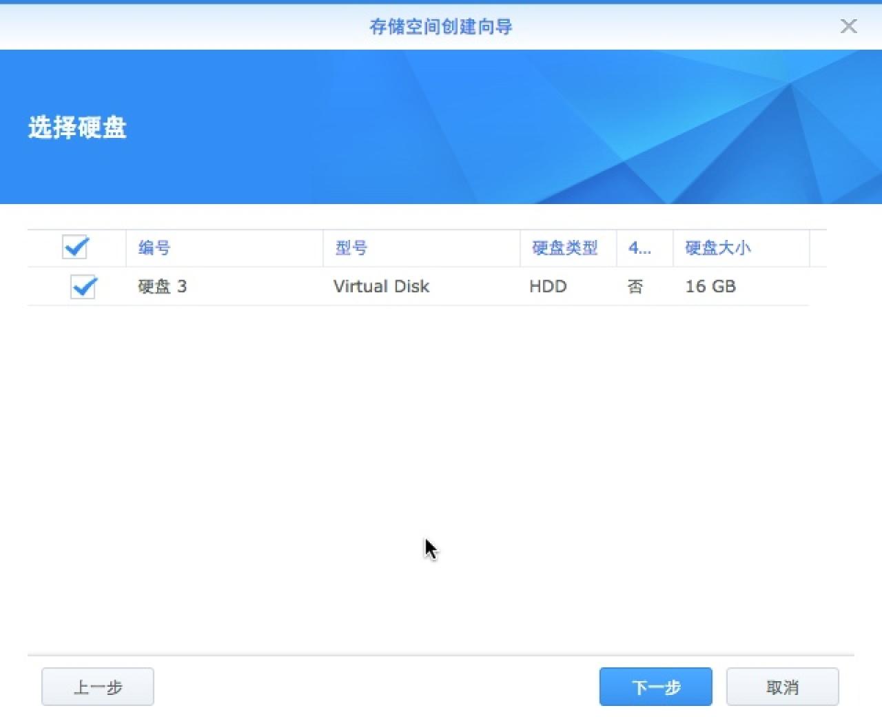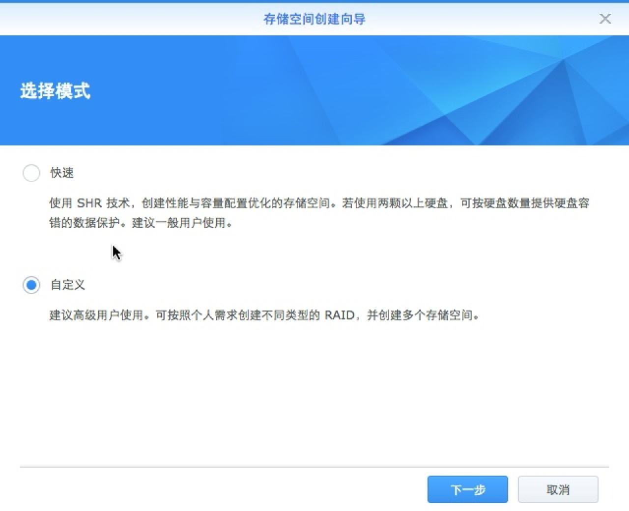 白群晖的话,一般来说直接使用系统自带的 Raid 来保障数据安全即可,Raid 是一种数据保护的技术,详细的介绍可以参考百度百科,简单一句话就是利用冗余来保证数据安全(毕竟多块硬盘同时坏掉的可能性比较低),还记得刚才在创建存储空间时候的那个步骤么?一般对于平常的双盘位 NAS 来说,选中两块硬盘并在下图的选项中选择“Raid 1”,即可最大程度的保障数据的安全,当然你也会有所损失,因为一块硬盘用于冗余数据,所以你实际可以实用的空间就只有一块硬盘的大小了。