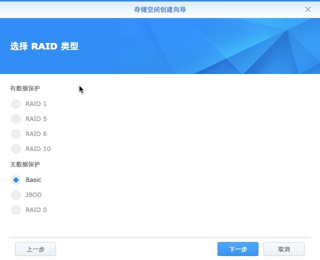 5.选择 Raid 类型,这一步骤涉及到数据安全的部分,我后面会详细来说,这里我由于只有一块硬盘,因此选择“Basic”,并点击下一步
