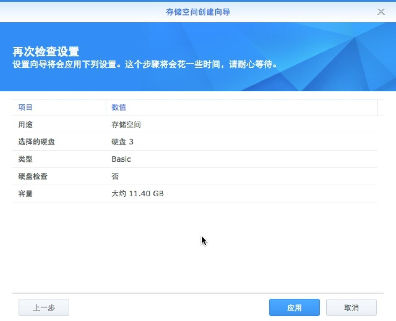 7.最后确认,点击“应用”,你的存储空间就创建完了,创建完存储空间,也就意味着你可以在 NAS 里面存储数据了。
