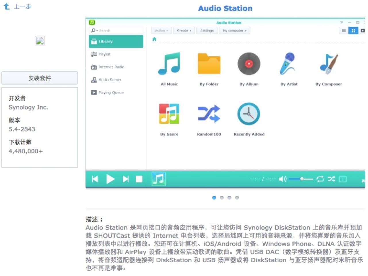与 VideoStation 类似,AudioStation 是一个基于音频的远程解码器,用于在任意设备上播放 NAS 中的音频文件。