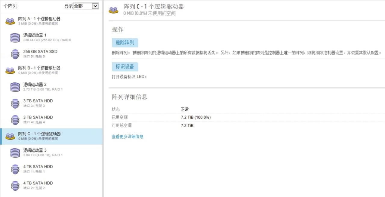 第一步,使用 Gen8 自带的 Raid 卡来创建你的 Raid 卷,对于不同的机器创建 Raid 的方式可能有所不同,下图是我创建好的 Gen8 的两个 Raid,均使用 Raid1 来保障数据的安全。