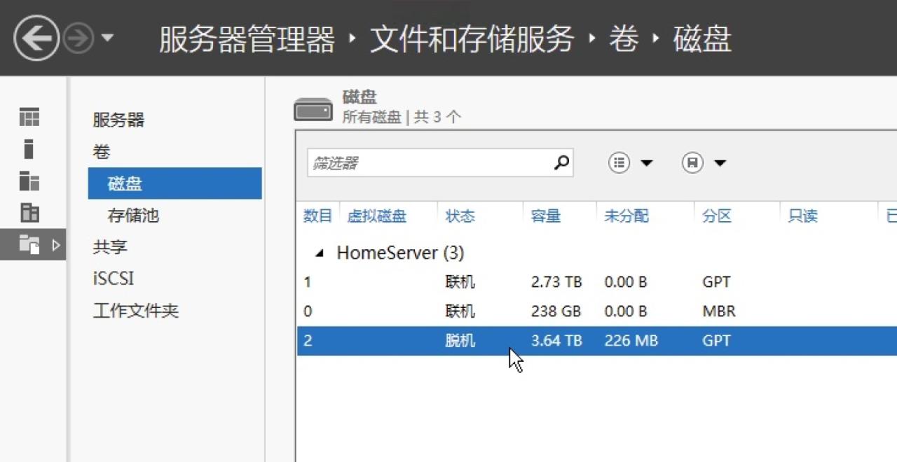 第二步,在 Windows2012中,进入服务器管理器–文件和存储服务–卷–磁盘,把你刚才创建的 Raid 卷右击并改为“脱机”,改为脱机的目的在于可以让 Hyper-V 中的群晖系统直接来使用这个卷。