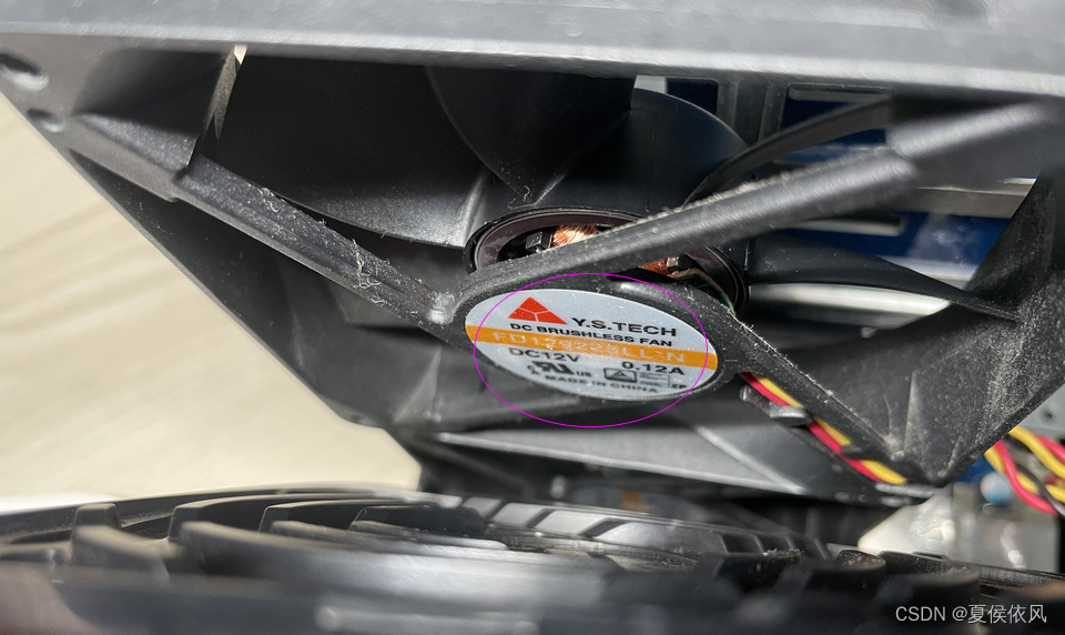 如果曾经拆下风扇,安装时注意风扇有标签的一面朝外,否则外壳凸起的塑料件会压住风扇叶片,使其无法转动。