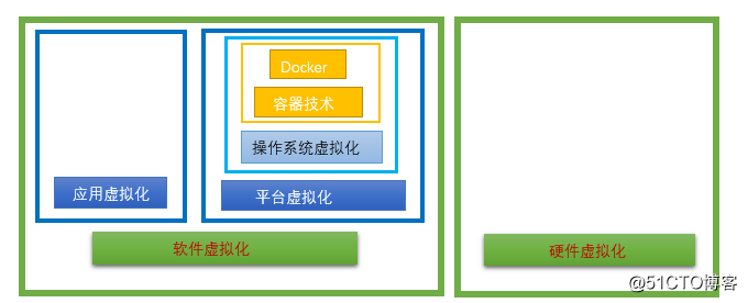 基于软件虚拟化又可分为应用虚拟化(如Wine)和平台虚拟化(如虚拟机),容器技术属于操作系统虚拟化,属于平台虚拟化的一种。