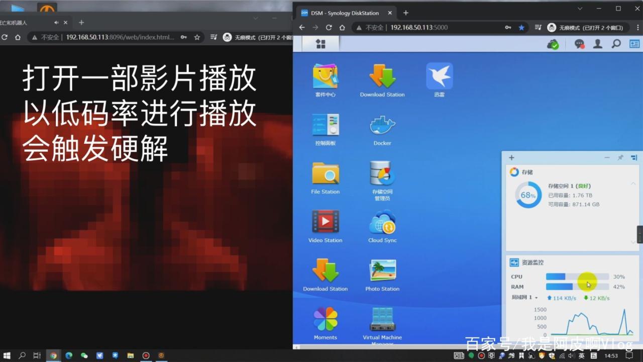 然后打开播放一部影片,选择低码率播放,一般就可以触发硬解了,返回群晖后台查看处理器占用率,显著下降了。