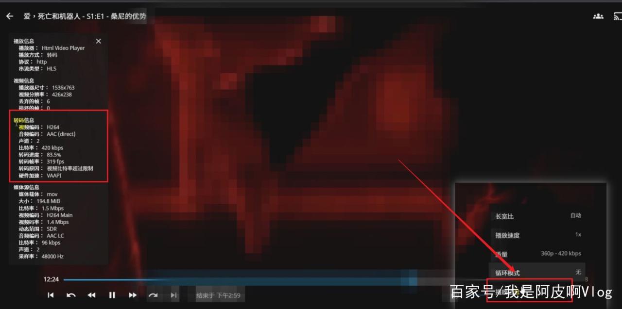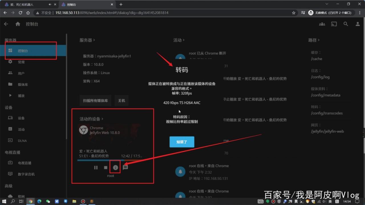 也可进入后台,找到控制台,查看活动的设备选项,会出现正在播放的客户端列表,点那个感叹号,就会出现提示,如果是转码状态就会出现了,也可以在影片播放页面选择查看影片的信息查看是否为转码状态,如果你选择的播放码率低于影片实际码率,都会触发转码。