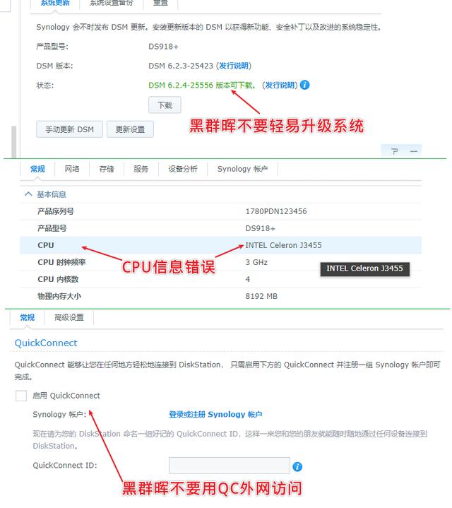 第三,黑群晖下的QC网络服务不能使用,也就是白群晖免费的外网访问。虽然现在也有更换SN序列号和MAC,来进行洗白的方式,让黑群晖使用QC外网访问。但是有概率会遭到群晖封IP!其实黑群晖完全不需要用QC,也可以通过其它方式来进行外网访问,我接下来也会说。