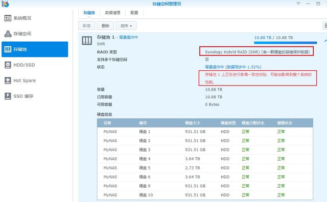 8、存储池组建完成,一共8块硬盘,合并成一个10.88TB的大容量空间。