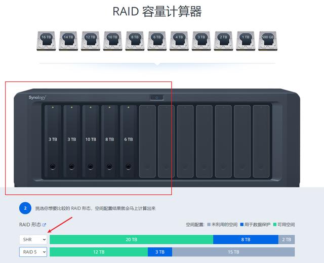 大家也可以到群晖的官网找到容量计算器,选择自己手里的磁盘容量,然后查看对应的阵列。