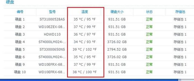 其中,西部数据的红盘,相对来说温度最低,而老服务器用的希捷硬盘,温度就最高。