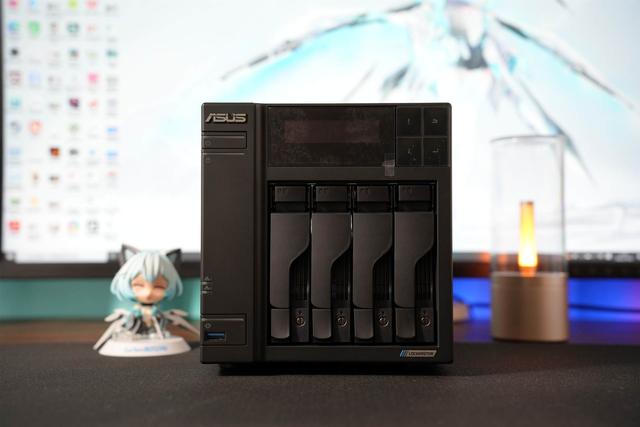 ▼6704T是华硕NAS产品线上最新的一代产品,该系列产品有双盘、四盘、六盘三种规格。在外观设计上有着浓浓的科技工业风。6704T体积比较小巧,一键备份按钮与电源按钮被巧妙地融合在了前面板中,前置有一个USB 3.2 Gen2接口,另外还有一块小屏幕配合四个实体按键可以与用户进行交互。