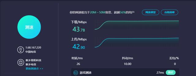 ▼测速得到了43Mbps的对等上传、下载速率,反复测试都是这个结果,延时与抖动都很低,这个网络可以说是非常稳定了,不满公司网络环境的小伙伴还是非常值得下手的。