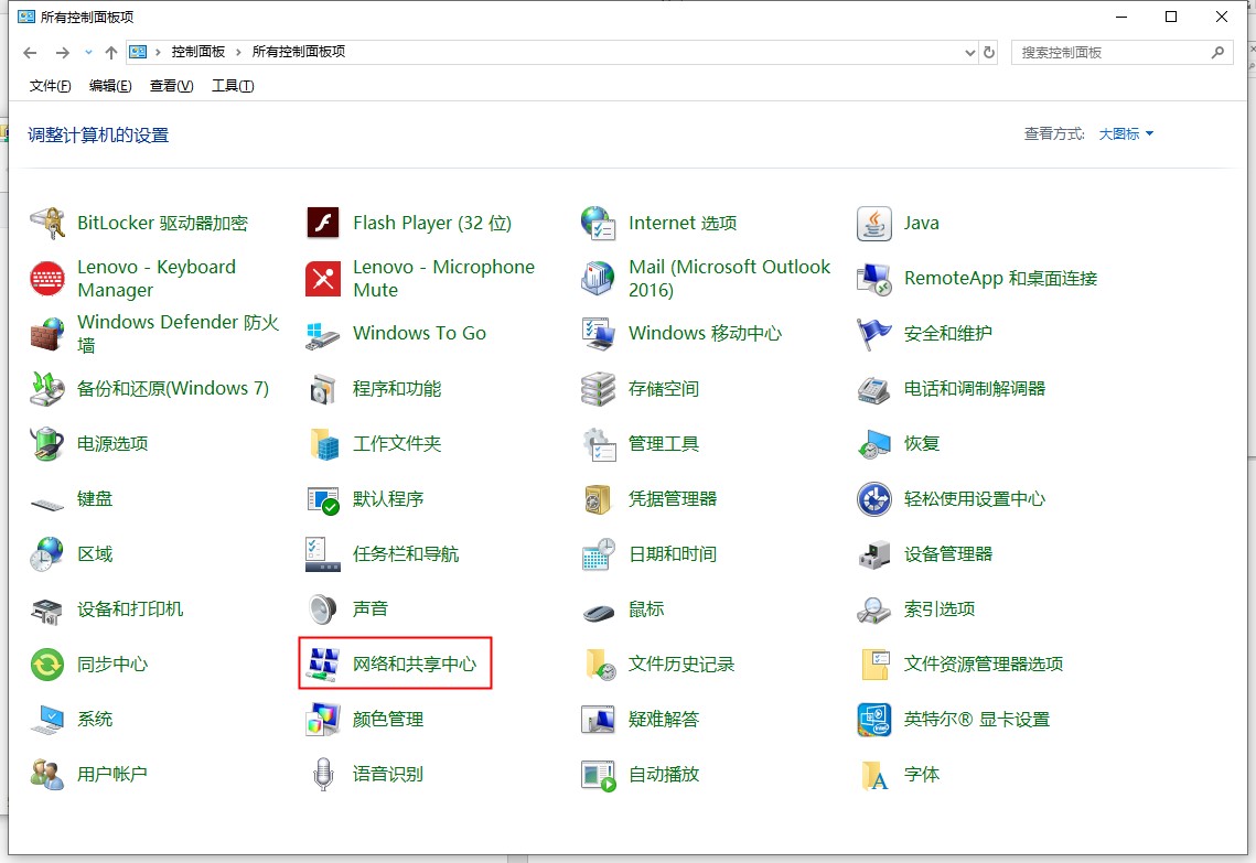 1、打开Windows 10系统控制面板,点击右上角的以图标方式显示,点击“网络和共享中心”选项。