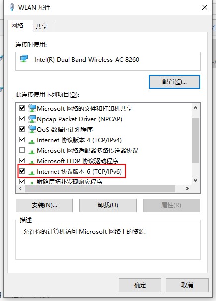 4、在网络连接属性窗口中选中“Internet 协议版本 6 (TCP/IPv6)”,然后点击“属性”。