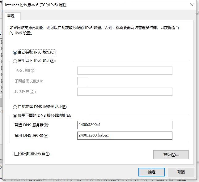 5、选择使用指定的DNS,在DNS服务器地址中输入2400:3200::1 和 2400:3200:baba::1,输入后确定退出即设置完成。