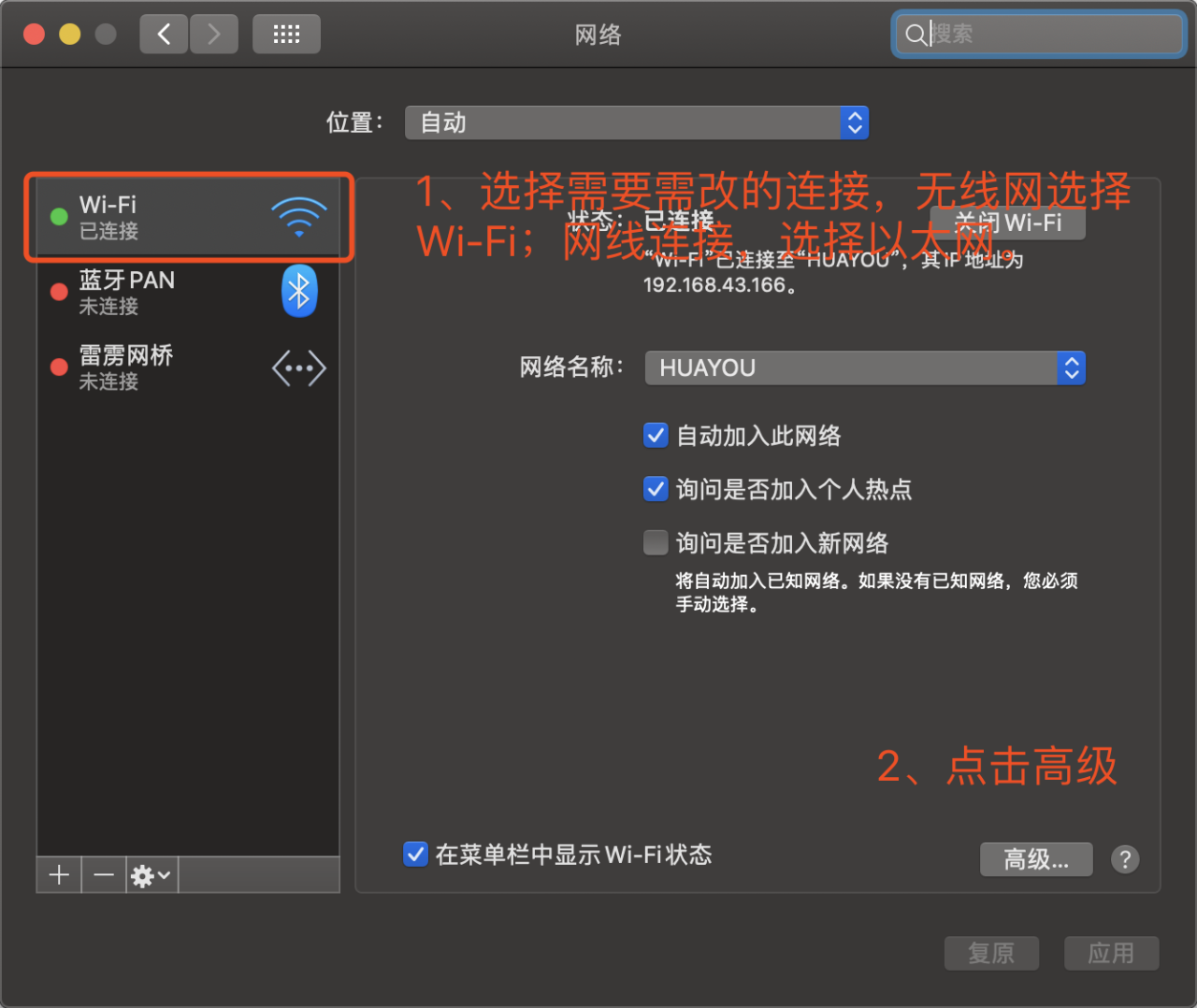 3、从列表中选择想要使用的网络连接服务(例如WIFI或以太网),然后点击“高级”