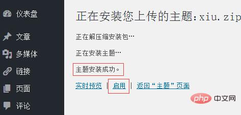 4、等待上传安装,主题安装成功后,点击“启用”即可安装新的WordPress主题。