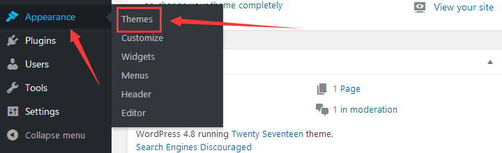 首先,登陆你的wordpress后台,WP后台的默认登陆地址是www.你的域名.com/wp-admin。然后在左边菜单栏找到 Appearance(外观) -> Themes(主题),并点击进入该页面。
