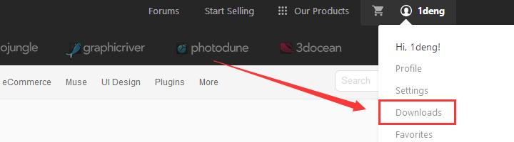 购买后,先登陆themeforest,右上角点击你的登陆名会显示一个下拉菜单,点击Downloads。