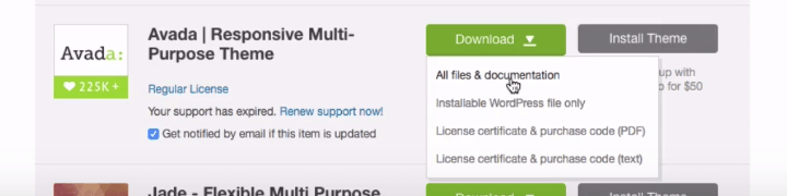 找到你购买的wordpress主题,一灯以Avada为例,你可以选择下载全部文件或是只下载主题的安装文件,如果你是第一次下载,我建议下载全部文件,里面包含了主题说明,demo,子主题等文件,是一个整合型的压缩文件包。