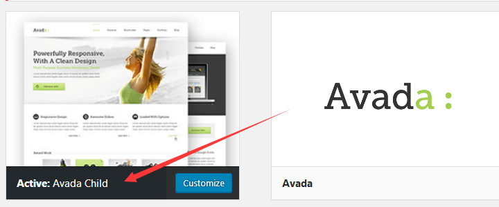 这个时候你再去 Appearance(外观) -> Themes(主题)那里,你会看到你已经启用了子主题(Avada-Child-Theme),并且看到两个Avada。