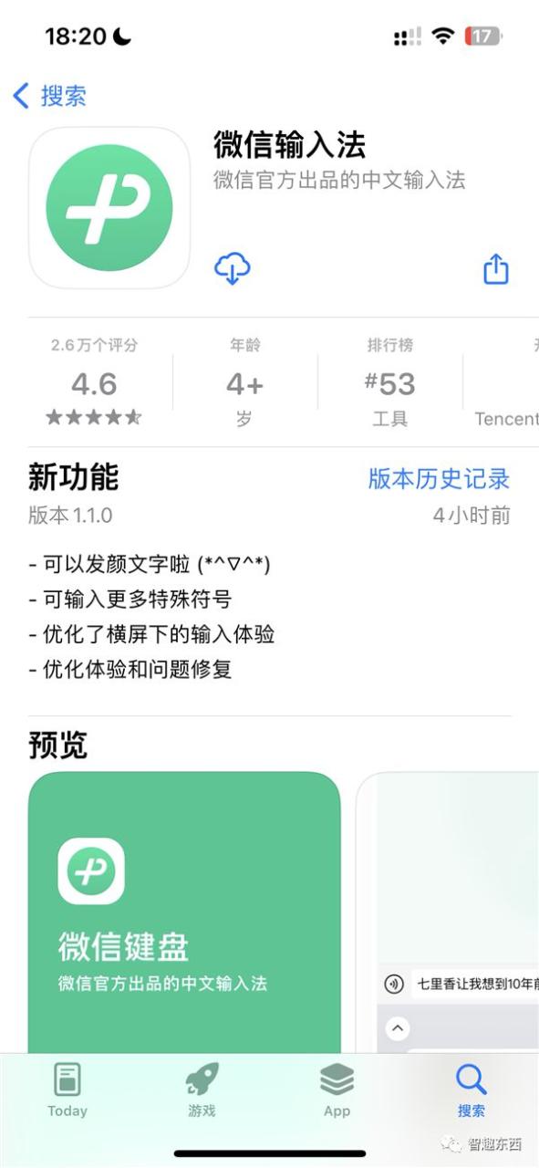 去年12月,微信键盘1.0.0正式在Android、iOS平台上线,这是微信官方出品的中文输入法。近日,微信键盘iOS版本发布1.1.0版本更新,更新后支持发送颜文字、输入更多特殊符号、优化横屏下输入法体验、优化体验和问题修复。