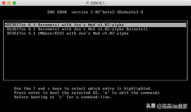 2,默认选择从U盘启动后选择第1个DS3617xs 6.1 Baremetal with Jun’s Mod v1.02-alpha按回车。