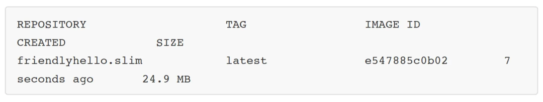 docker-slim 工具对胖镜像进行一系列的检查、测量,最终创建一个瘦版本的镜像。让我们看看这个减过肥的大小吧。