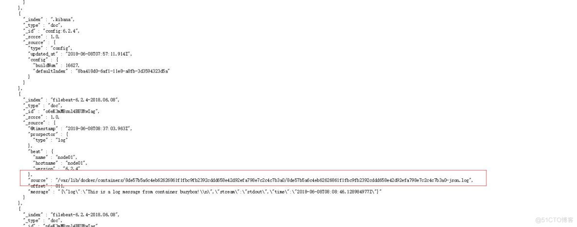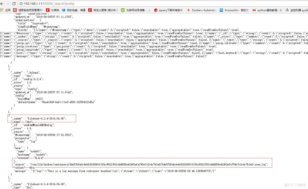 Filebeat 启动后,正常情况下会将监控的日志发送给 Elasticsearch。刷新 Elasticsearch 的 JSON 接口 http://192.168.1.111:9200/_search?pretty 进行确认。能够看到 filebeat-* 的 index,以及 Filebeat 监控的那两个路径下的日志。