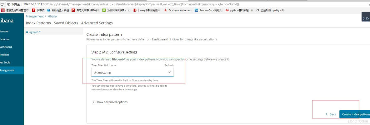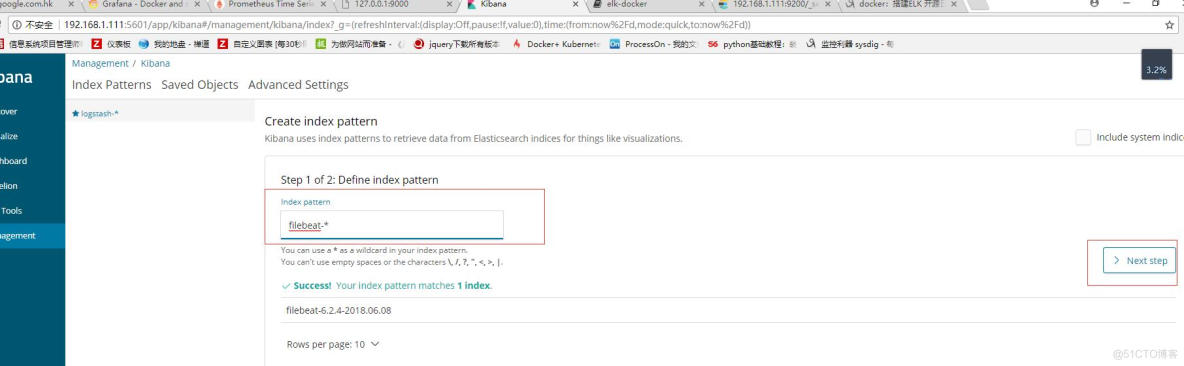 kibana页面 http://192.168.1.111:5601 添加相应的索引,Create index pattern,指定 index pattern 为 filebeat-*,这与 Elasticsearch 中的 index一致。