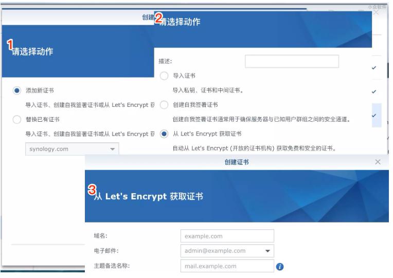 在 3 域名处,输入你的 xxx.synology.me,然后选择一个邮箱,备选留空,点击下一步就完成了,无需验证域名。