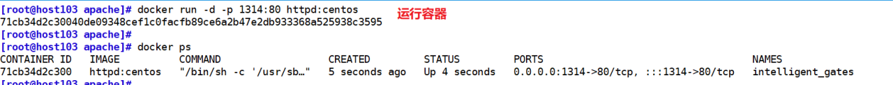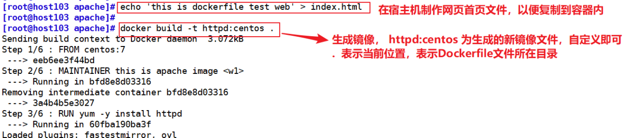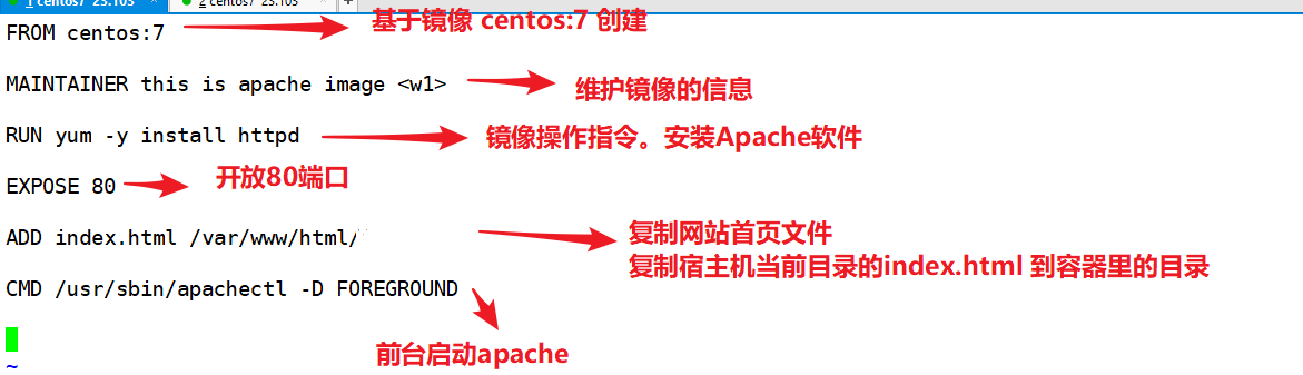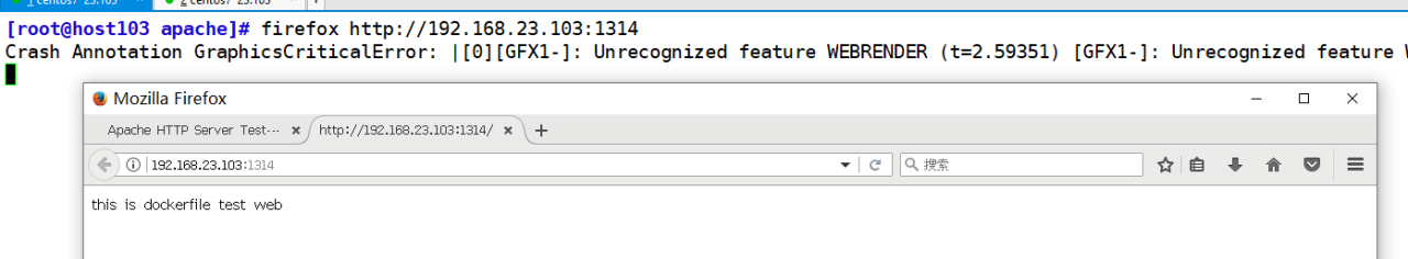 #建立工作目录 [root@host103 ~]# mkdir /opt/apache [root@host103 ~]# cd /opt/apache/ #创建Dockerfile文件 [root@host103 apache]# vim Dockerfile #基于的基础镜像是centos:7 FROM centos:7 #维护镜像的用户信息 MAINTAINER this is apache image <w1> #镜像操作指令,安装apache软件 RUN yum -y install httpd #开放80端口 EXPOSE 80 #复制网站首页文件,从宿主机当当前目录复制index.html 到容器的/var/www/html/目录下 ADD index.html /var/www/html/index.hml #启动容器时执行的脚本.前台启动apache服务 #使用 foregound 前台运行apache 。因为docker 容器必须要有一个pid 为1 的进程在运行 CMD /usr/sbin/apachectl -D FOREGROUND #在宿主机工作目录创建网站首页文件,以便dockerfile 可以复制到容器里 [root@host103 apache]# echo 'this is dockerfile test web' > index.html #生成镜像 . 表示在当前目录寻找Dockerfile文件 [root@host103 apache]# docker build -t httpd:centos . #运行容器,并且将容器的80端口映射到宿主机的1314端口 [root@host103 apache]# docker run -d -p 1314:80 httpd:centos [root@host103 apache]# docker ps CONTAINER ID IMAGE COMMAND CREATED STATUS PORTS NAMES 71cb34d2c300 httpd:centos "/bin/sh -c '/usr/sb…" 5 seconds ago Up 4 seconds 0.0.0.0:1314->80/tcp, :::1314->80/tcp intelligent_gates #浏览器访问宿主机ip:1314端口 [root@host103 apache]# firefox http://192.168.23.103:1314