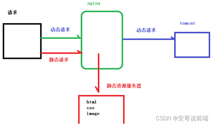 例如接口是必须动态去请求的,那么我们图片img或者一些pdf文件,就没必要叫后端再给你接口返回,可以在nginx配置,直接静态获取你存放在服务器上的图片。