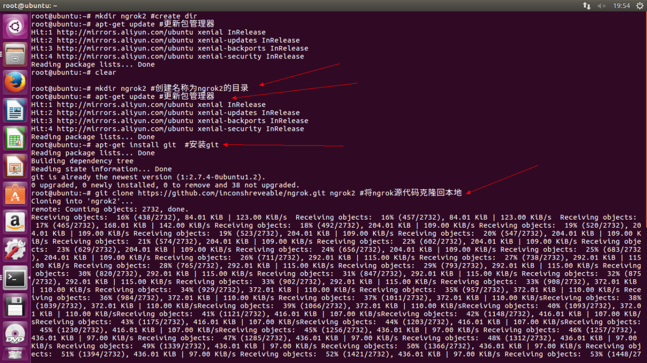 mkdir ngrok #创建名称为ngrok的目录 apt-get update #更新包管理器 apt-get install git #安装git git clone https://github.com/inconshreveable/ngrok.git ngrok2 #将ngrok源代码克隆回本地
