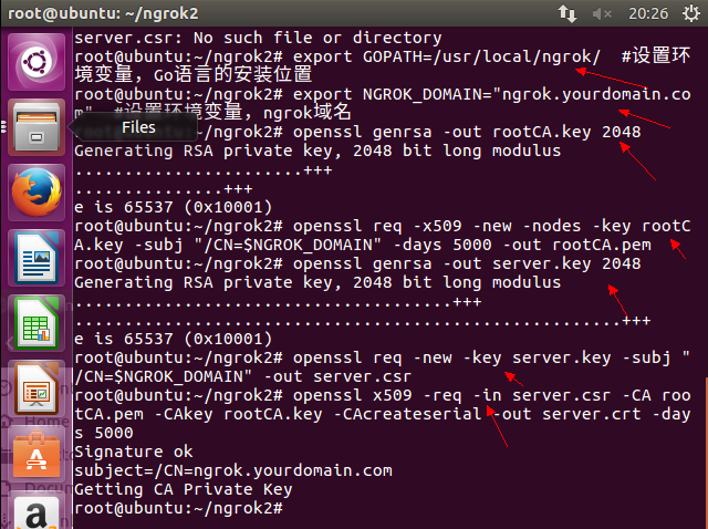 export GOPATH=/usr/local/ngrok/ #设置环境变量,Go语言的安装位置 export NGROK_DOMAIN="ngrok.yourdomain.com" #设置环境变量,ngrok域名