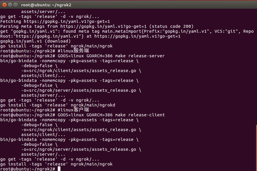 由于go语言的特性,在编译时直接生成机器码,所以在运行过程中并不需要go的环境(非托管应用)。在ngrok目录下,运行一下命令分别生成对应的客户端与服务端。