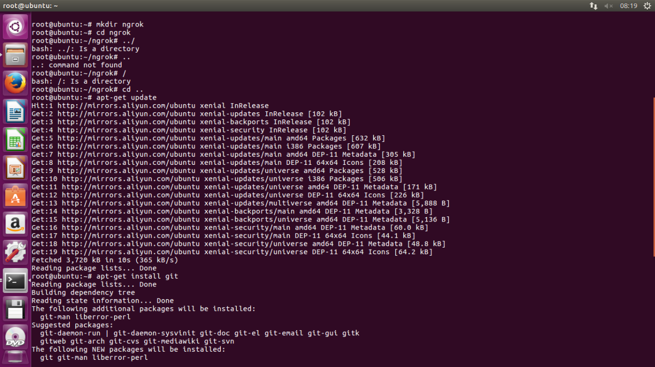 ngrok的源代码托管在github上,可以先在ubuntu下安装git再将ngrok的源代码克隆到本地。