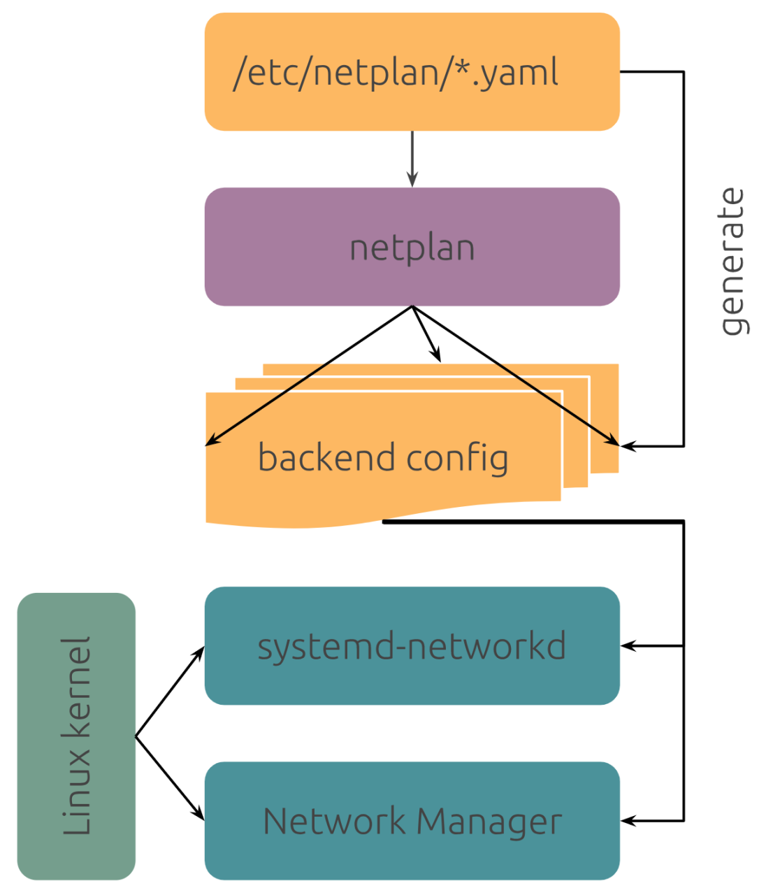 Netplan 根据描述文件中定义的内容自动生成其对应的后端网络守护程序所需要的配置信息,后端网络守护程序再根据其配置信息通过Linux 内核管理对应的网络设备。